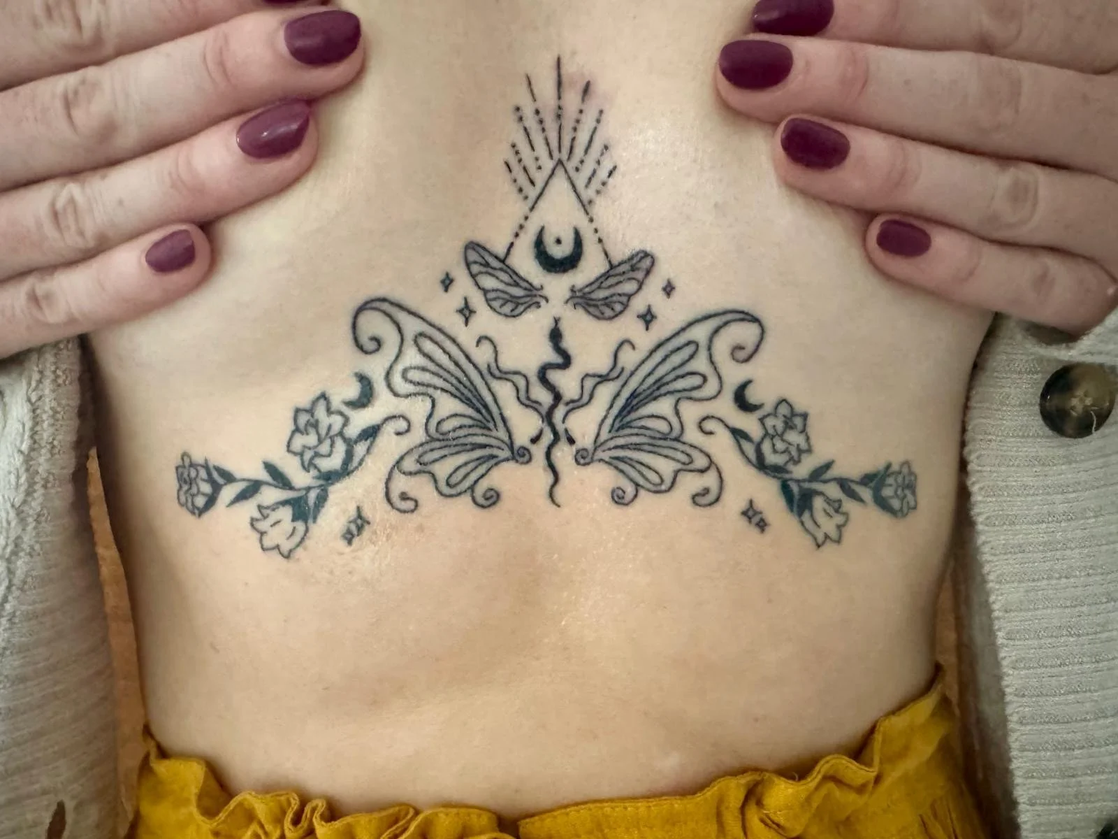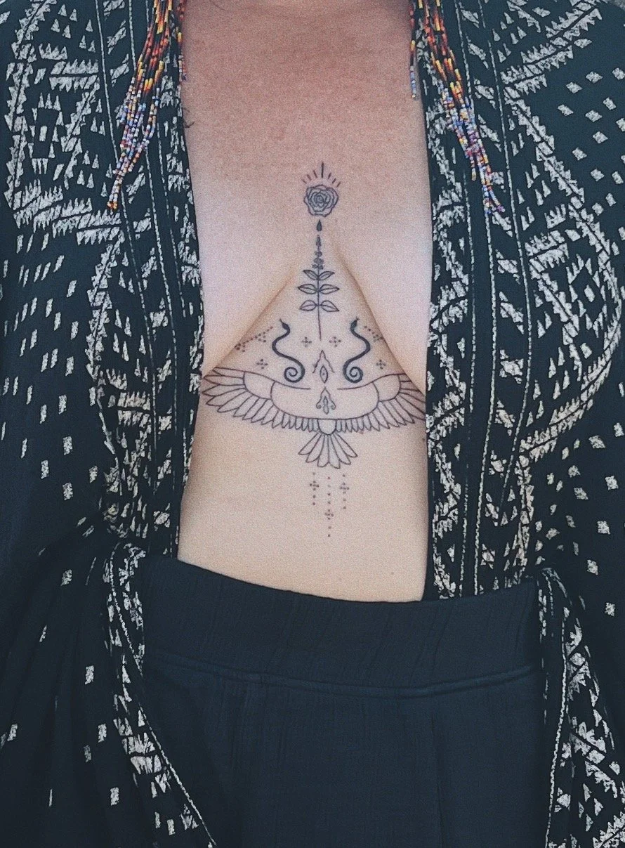 This is deep feminine medicine work, not just a pretty spiritual tattoo. The tattoo itself is a symbol of our journey, an anchoring of the medicine of your soul, a bridge for you to access your light. You are the true medicine. The effects will reflect the clarity of your intentions, desires, openness, willingness to walk through the thresholds life is calling you into, and trust in the mystery. Your intention and what you come in with steer the ship of our container. These multi-day, healing-retreat-like ceremonies catalyze one’s transformation. They are an initiation into an expanded expression of Self, guiding each person to move further in alignment with their creative power, oracular gifts, voice, purpose, and the heart’s ancient wisdom. Together, we are building a bridge for you to stream through more of your souls song through you. By bringing a soul-led, channeled art piece with powerful intention woven with the melodies of your unique song onto the skin, we are opening a portal for embodied evolution through the piercing of the skin and, thus, the piercing of the veil. Anything of lower resonance held within the body and energy body will begin to release to align with the frequency of the Soul Tattoo (your soul’s signature). These may be outdated beliefs, familiar patterns, mental limitations, energetic blocks, trauma, stagnant emotions, karmic loops, past life stories, ancestral curses, or any other karmic limitations carried in your body and field, which all begin the moment you book your ceremony dates. Soul Tattoos can help strengthen one’s soul gifts, draw out prolific divine artistry, activate one into their true medicine and purpose, dissolve creative blocks that stand in the way of your expanded expression, inspire a bolder, more creative, heart-centered and expressed life, call out one’s truth and higher vision, reclaim one’s power, voice, and desires, and integrate one’s soul light into embodied form.